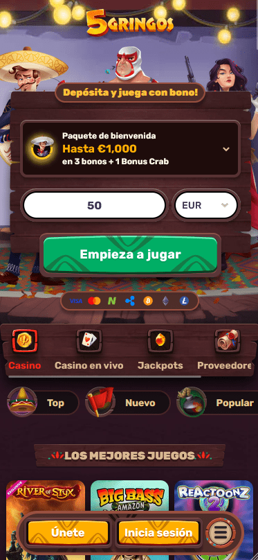 El bono de bienvenida en 5Gringos Casino incluye varias opciones, como un 100% de bono hasta 500€ con 200 giros gratis y 1 bonus crab, 3 giros gratis por cada 1€ depositado, un 150% de bono hasta 75€ con 1 bonus crab, y un bono de hasta 1000€ dividido en 3 partes con 1 bonus crab.
