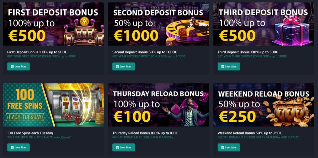 - Bono Instantáneo de Hasta 500€: Luego del segundo depósito y en los siguientes, puedes obtener hasta 500€ disponibles para jugar.