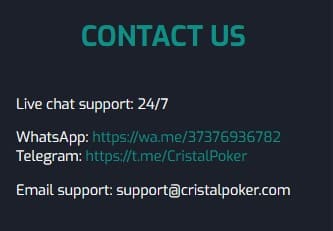 Cristal Poker ofrece un servicio de atención al cliente accesible y eficiente. Los jugadores pueden contactar al equipo de soporte mediante varias vías, incluyendo correo electrónico, chat en vivo y canales de mensajería instantánea como Telegram y WhatsApp.