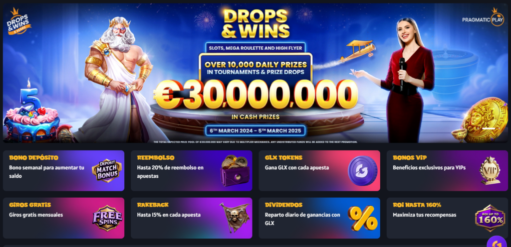 | 🎁 Bonos y Promociones | Potenciadores únicos, sistema de Rakeback, recompensas GLX |
