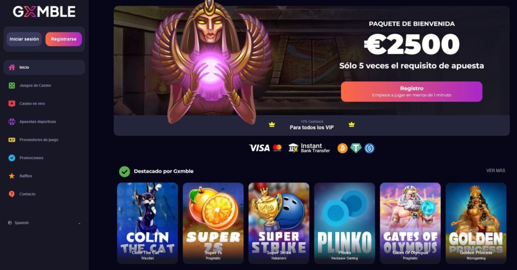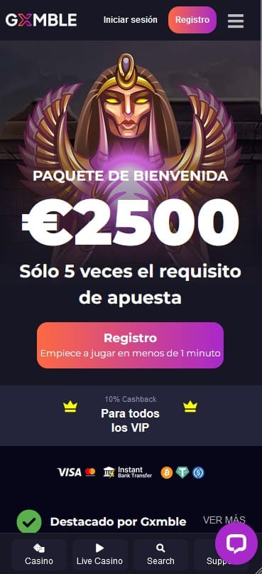 Gxmble es un casino sin licencia relativamente nuevo que abrió sus puertas en 2022. Ofrece sus servicios en 11 idiomas, incluido el español, y su oferta combina las apuestas deportivas con una amplia selección de juegos de casino.